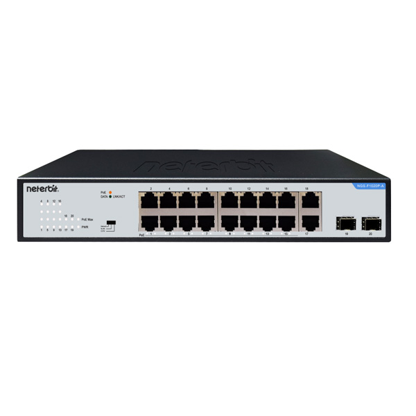 سوئیچ Neterbit NGS-F1020P-A یک سوئیچ غیرمدیریتی (Unmanaged) با پورت‌های گیگابیتی است که برای شبکه‌های اداری، سازمانی و ساختمانی طراحی شده است. این دستگاه با پشتیبانی از استانداردهای IEEE802.3af/at PoE قادر است برق مورد نیاز دستگاه‌هایی مانند اکسس پوینت، دوربین مدار بسته (CCTV) و تلفن‌های تحت شبکه (IP Phone) را مستقیماً از طریق کابل شبکه تأمین کند.