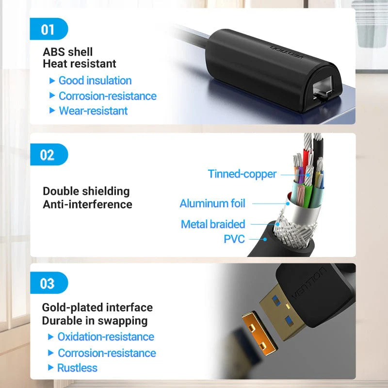 آداپتور Vention USB 3.0 Gigabit Ethernet یک راه‌حل ساده و کارآمد برای دسترسی به اینترنت سیمی است. کافیست آن را به پورت USB لپ‌تاپ یا PC وصل کنید تا بدون نیاز به کارت شبکه داخلی، به شبکه LAN متصل شوید. این محصول برای کاربرانی که به سرعت بالا و پایداری بیشتر نسبت به WiFi نیاز دارند، بسیار کاربردی است.